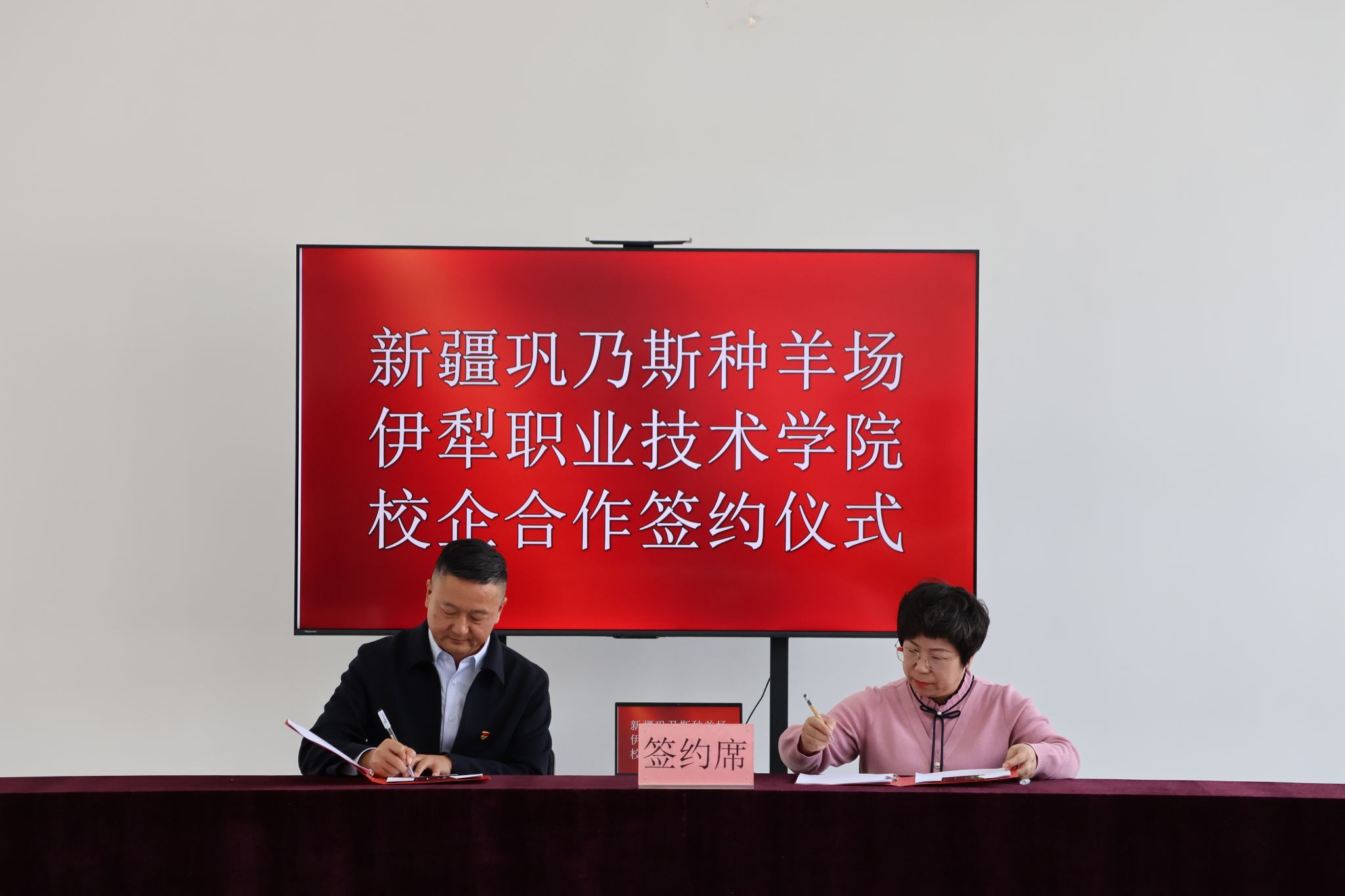 在全体与会人员的共同见证下,双方正式签署校企战略合作框架协议,标志着彼此的合作迈入实质性推进阶段。签约仪式后,现场同步举行揭牌仪式,周钰院长与安玮董事长共同为“伊犁职业技术学院巩乃斯畜牧兽医产业学院”“伊犁职业技术学院教师企业实践基地”揭牌,掀开了校企协同育人、共促产业发展的崭新篇章。