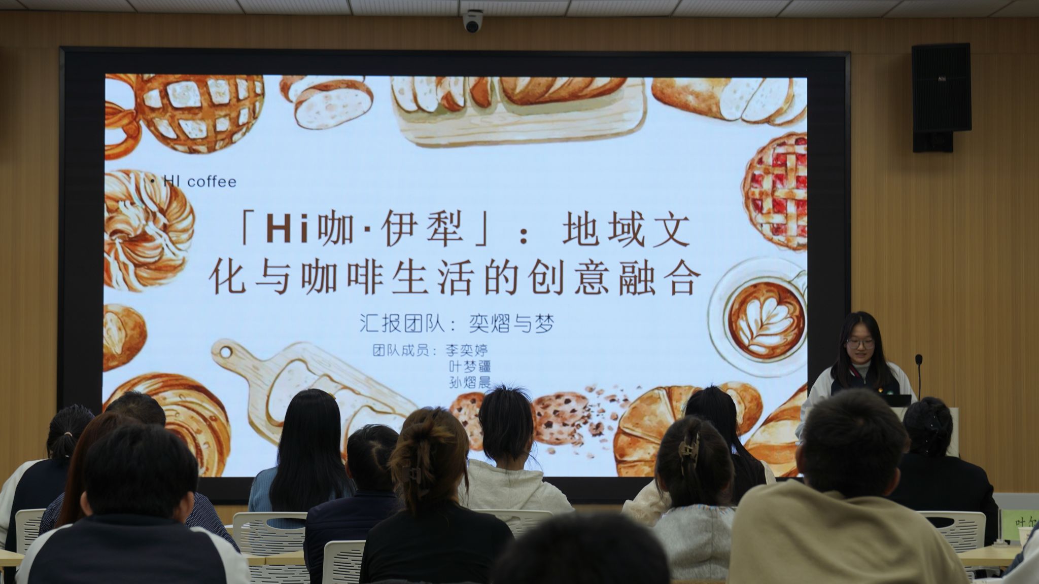 决赛现场,副校长高大响、中创投资顾问马超等领导嘉宾莅临指导。参赛选手依次登台,在3分钟内脱稿阐述设计理念。作品各具特色:有的融合伊犁河谷自然景观,有的借鉴哈萨克族刺绣纹样,有的注重商业应用价值,充分展现了学生的创意才华。