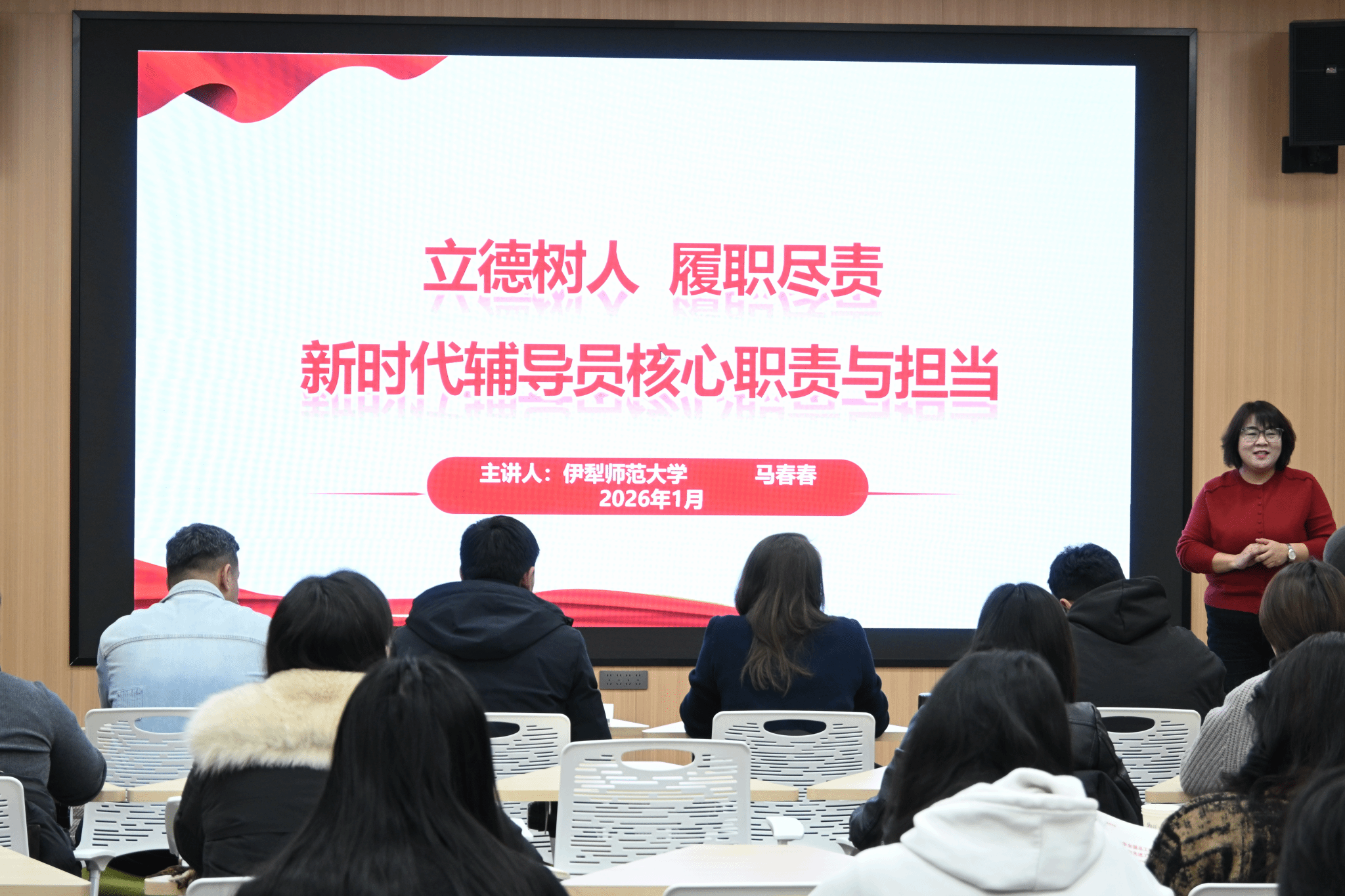 为切实加强我院辅导员队伍建设,提升辅导员队伍的专业素养与工作能力,2026年1月22日下午4时,学生工作部在综合楼录播教室成功举办了辅导员专题培训会。本次培训特邀伊犁师范大学学工部副部长、名辅导员工作室主持人马春春老师莅临主讲,为我校全体辅导员带来了一场内容丰富、指导性强的实务分享。各学院分管学生工作领导、学管办主任及全体专兼职辅导员参加了本次培训。